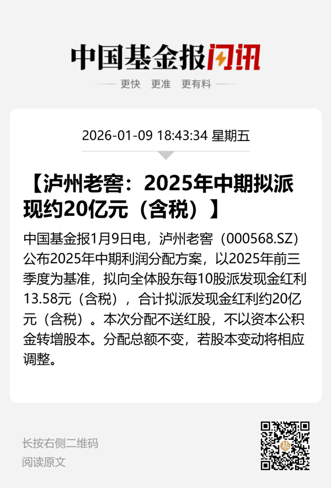 1月9日晚间,白酒巨头泸州老窖(证券代码:000568)发布2025年中期利润分配方案。公司拟向全体股东每10股派发现金红利13.58 元(含税),合计拟派发现金红利约20亿元(含税)。