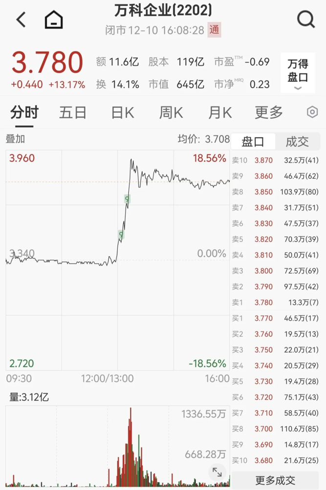 12月10日,万科企业午后狂飙,最高涨幅达18.56%,全天收于3.78港元/股,涨13.17%。