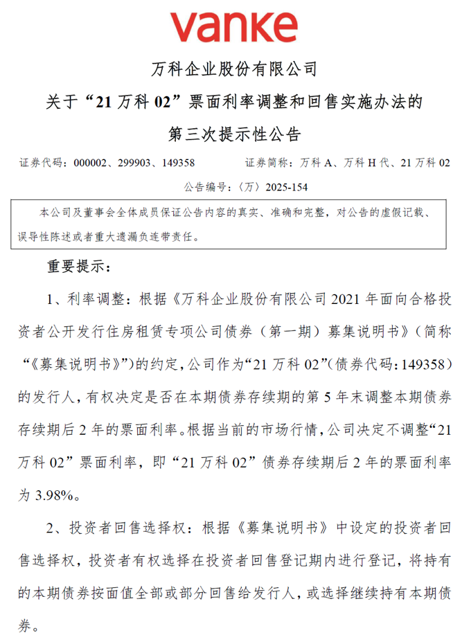 根据万科企业12月9日发布的《关于“21万科02”票面利率调整和回售实施办法的公告》,将不调整“21万科02”票面利率,维持在3.98%,投资者享有回售选择权:投资者可在2025年12月9日至15日(仅限交易日)的回售登记期内,选择将持有的“21万科02”全部或部分回售给发行人,回售价格为人民币100元/张(不含利息)。