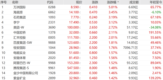 恒生指数成份股中43只上涨,42只下跌。其中,万洲国际上涨5.01%,海底捞上涨3.45%,石药集团上涨3.19%,领涨蓝筹。