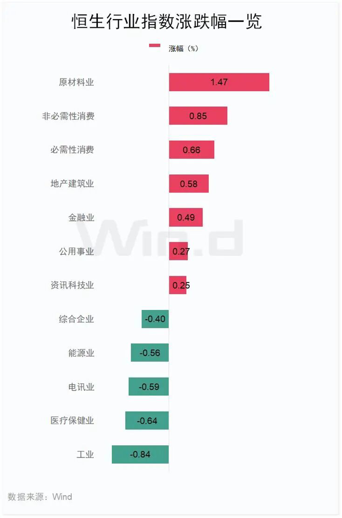 恒生行业指数方面,原材料业上涨1.47%,非必需性消费上涨0.85%,必需性消费上涨0.66%;跌幅方面,工业下跌0.84%,医疗保健业下跌0.64%。