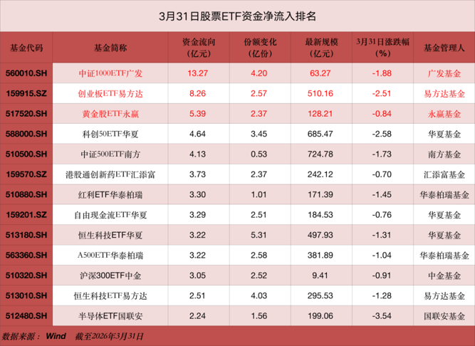 Wind数据显示,截至3月31日,全市场1366只股票ETF(含跨境ETF)总规模达3.74万亿元。在股市下跌行情中,股票ETF市场整体净流入30.1亿元。从大类型来看,上一交易日债券ETF与商品ETF均呈现明显净流入,分别达52.94亿元与26.98亿元,反映出资金在不确定性环境下的避险需求。商品ETF主要是黄金ETF。具体到指数维度,头部宽基系列品种最为“吸金”,中证1000指数净流入达15.9亿元。其中,中证1000ETF广发资金净流入最多,达13.27亿元。另外,创业板、恒生科技、半导体等板块的资金净流入同样居前,单日净流入分别为13.2亿元、11.5亿元、7.2亿元。从近5日角度观测,近期资金流入恒生科技指数超13亿元,亦显示资金对港股科技投资的关注。在市场震荡背景下,头部基金公司旗下ETF仍持续获得资金净流入。易方达基金ETF最新规模为5975亿元,昨日净流入4.5亿元。其中,创业板ETF易方达规模510.16亿元,单日净流入达8.26亿元;黄金ETF易方达规模418.32亿元,单日净流入2.64亿元;恒生科技ETF易方达规模295.53亿元,单日净流入2.51亿元。华夏基金ETF方面,上一交易日,科创50ETF华夏和自由现金流ETF华夏单日净流入居前,分别净流入4.64亿元和3.29亿元,最新规模分别达685.47亿元和184.53亿元,对应跟踪指数近一月日均成交额分别为36.39亿元和8.54亿元。恒生科技ETF华夏净流入也超3亿元。广发基金旗下22只ETF昨日获资金净流入,囊括百亿宽基、热门黄金、AI链、电力链等多个主题。除了旗下中证1000ETF广发外,电池ETF广发、创业板ETF广发、信用债ETF广发等单日获资金净流入均超1亿元,最新规模均超百亿元。金ETF广发单日获资金净流入0.64亿元,最新规模超76亿元,该产品近5年年化回报超21%。各类宽基和港股ETF资金流向分化明显
