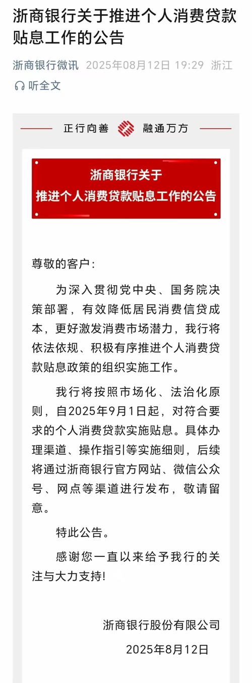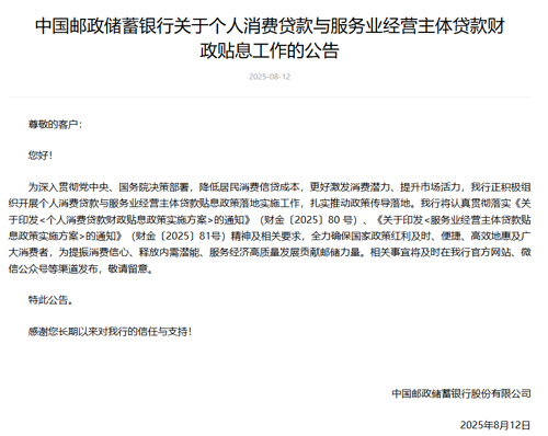 8月12日,邮储银行发布关于个人消费贷款与服务业经营主体贷款财政贴息工作的公告,表示将扎实推动政策传导落地。