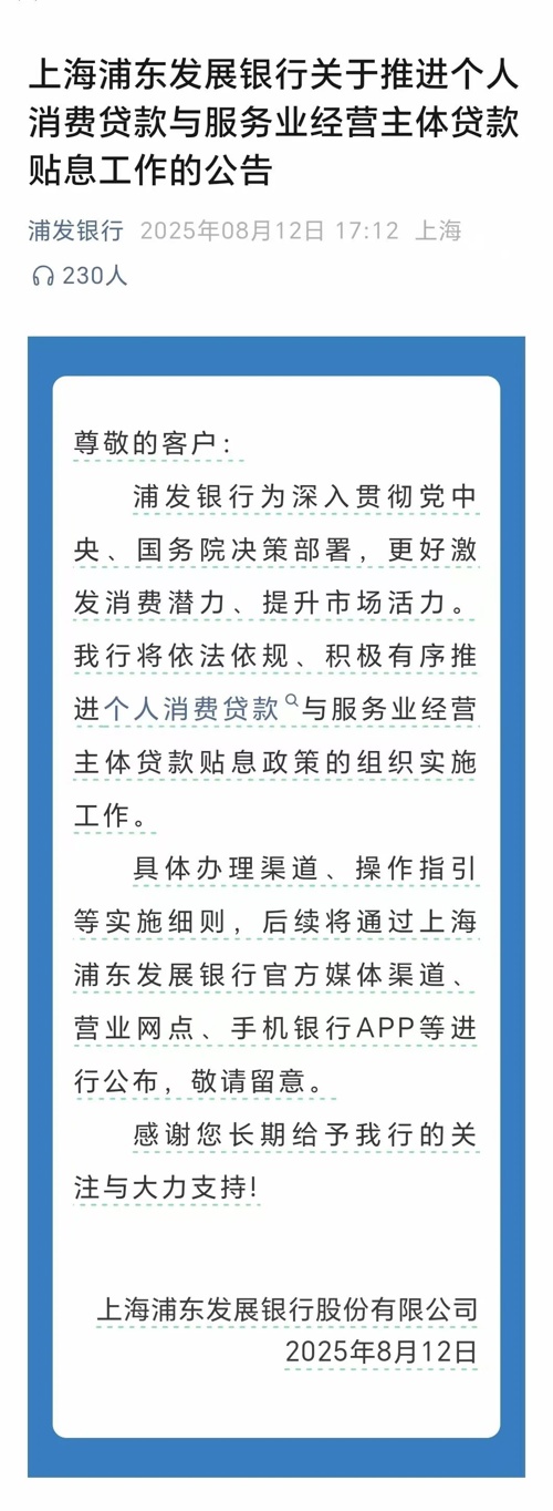 同日,浦发银行发布公告称,该行将依法依规、积极有序推进个人消费贷款与服务业经营主体贷款贴息政策的组织实施工作。具体办理渠道、操作指引等实施细则,后续将通过该行官方媒体渠道、营业网点、手机银行App等进行公布。
