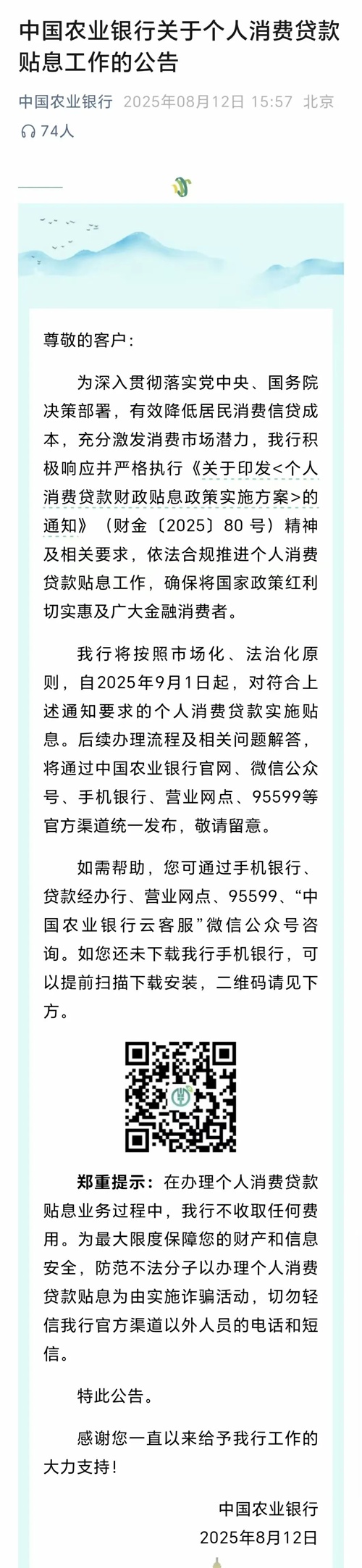 8月12日,即两份方案出台当日,农业银行“火速”发布消息称,为有效降低居民消费信贷成本,充分激发消费市场潜力,该行将依法合规推进个人消费贷款贴息工作,确保将国家政策红利切实惠及广大金融消费者,自9月1日起,对符合要求个人消费贷款实施贴息。