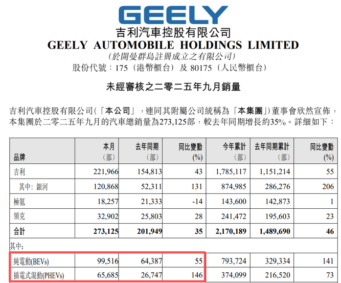 吉利9月销量达27.31万辆,同比增长35%,其中新能源销量达16.52万辆,同比增长81.27%,环比增长12.12%。