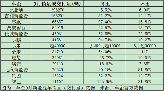 9月交付量同样创新高的是小鹏、小米,分别为4.16万辆、超4万辆。