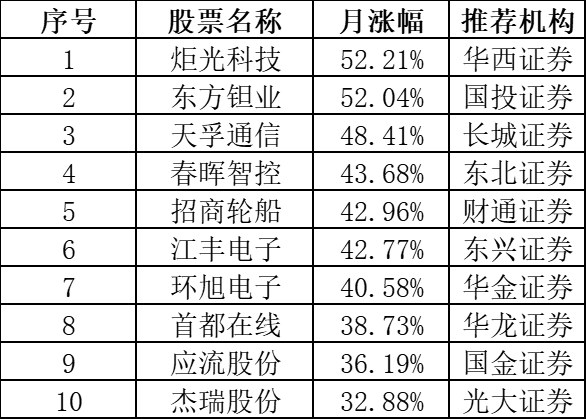 此外,由东北证券推荐的春晖智控、财通证券推荐的招商轮船、东兴证券推荐的江丰电子、华金证券推荐的环旭电子当月涨幅也超40%。