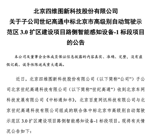 8月7日,四维图新发布公告表示,子公司世纪高通与北京百度网讯科技有限公司组成的联合体中标北京市高级别自动驾驶示范区3.0扩区建设项目路侧智能感知设备-1标段项目,中标总金额为2.5亿元。