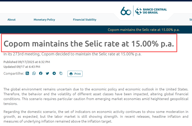 当地时间9月17日,巴西中央银行货币政策委员会(Copom)宣布,将基准利率(Selic)维持在15%不变。此次维持基准利率不变的决定,获得了委员会成员的一致通过。