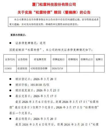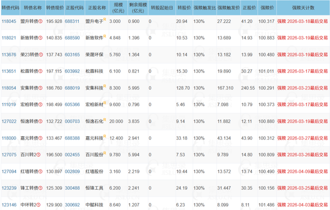 3月9日,松霖转债公告称,该转债最后交易日为3月17日,最后转股日为3月20日,可转债的赎回价格为101.011元/张(含息税)。截至3月16日收盘,松霖转债的价格为197.115元,如果未能及时卖出或转股被强制赎回,投资者按目前价格将损失48.76%。松霖转债的正股松霖科技股票自2026年1月30日至2月27日连续15个交易日收盘价高于公司“松霖转债”当期转股价格(15.30元/股)的130%(即不低于19.89元/股),已满足赎回条件。同样地,宏柏转债也将迎来强赎,最后交易日为3月17日,最后转股日为3月20日,赎回价为100.3726元。而宏柏转债最新收盘价格为198.499元,不操作同样要亏将近50%。