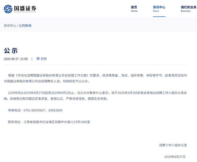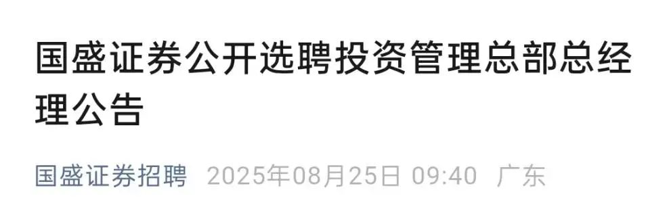 8月25日,微信公众号“国盛证券招聘”发布公开选聘投资管理总部总经理的公告。