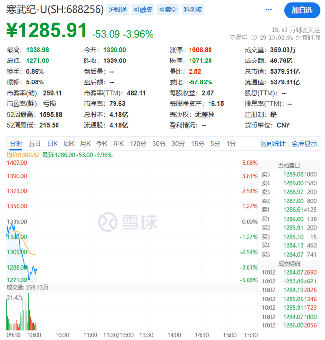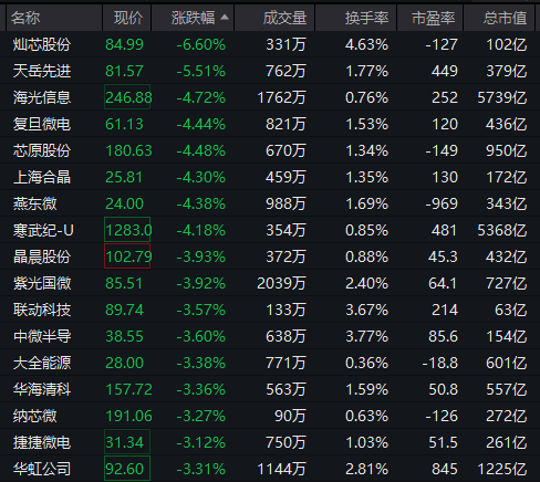 半导体产业链短线走弱,寒武纪一度跌超5%,海光信息、复旦微电、芯原股份等跌超4%,中芯国际跌超2%。