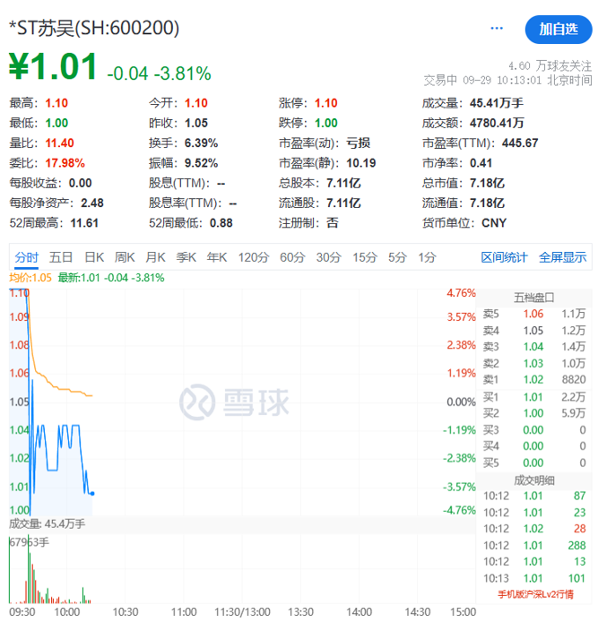 *ST苏吴盘中上演“天地板”,随后震荡调整,截至发稿,该股报1.01元/股。