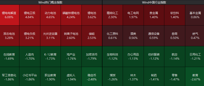 板块上来看,锂电池及相关产业链走强,精细化工、电工电网、存储芯片等板块走强;教育、零售、制药板块震荡调整。