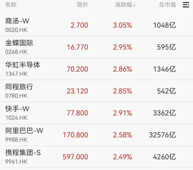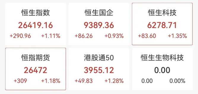 港股方面,恒生科技指数涨超1%,商汤、金蝶国际、华虹半导体涨幅居前。