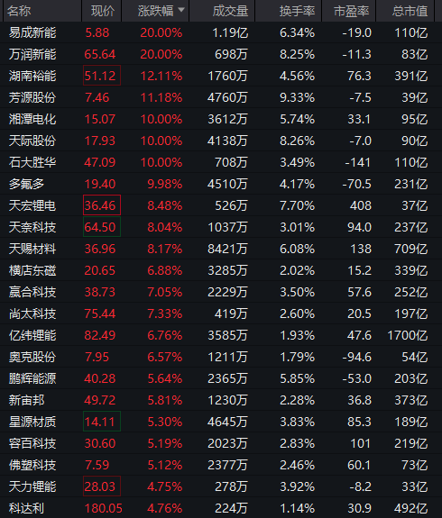 锂电池及相关产业链走强,易成新能、万润新能均实现20%涨停,天际股份、石大胜华、湘潭电化、多氟多等多股涨停,天赐材料、亿纬锂能等跟涨。
