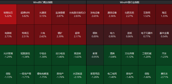从板块看,发电设备涨幅居前,通信设备、互联网、超硬材料等板块表现活跃,而房地产、保险、锂电等板块跌幅居前。