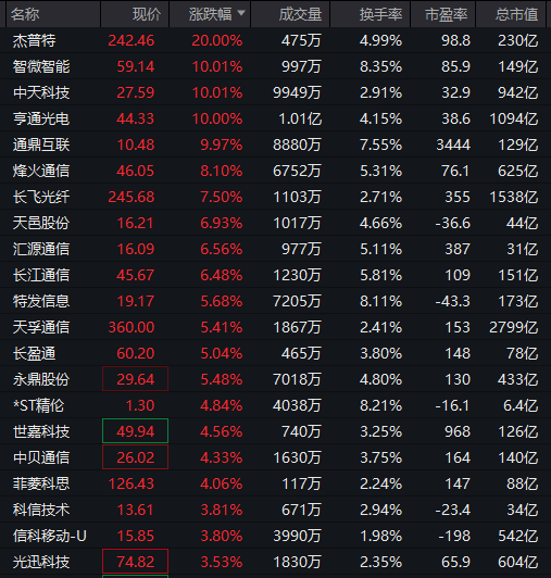 通信设备板块表现强势,杰普特20%涨停,智微智能、中天科技、亨通光电、通鼎互联等纷纷涨停。