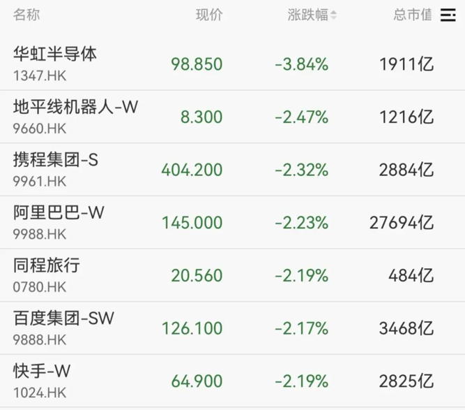 港股方面,恒生科技指数跌超1%,华虹半导体、地平线机器人、阿里巴巴等跌超2%。