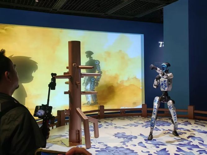艺术秀“青花武馆”单元设有人形机器人表演咏春拳的展台,在开馆期间每隔一个小时表演一次,成为艺术秀最受年轻观众喜爱的单元。