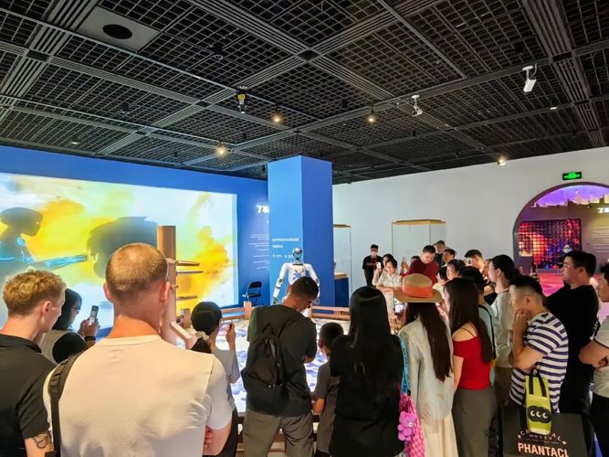 艺术秀以“周同学”为叙事线索,通过数字科技与潮流艺术语言,将上海博物馆的十二件馆藏珍贵文物,与AI光影、全息投影、机器人互动、NFC(近场通信技术)数字抽卡等现代技术融合,为观众打造一个传统与现代碰撞、过去与未来共鸣的沉浸式文化现场。