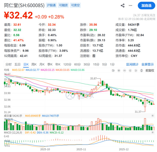 截至12月19收盘,A股同仁堂股价为32.42元/股,总市值为445亿元。