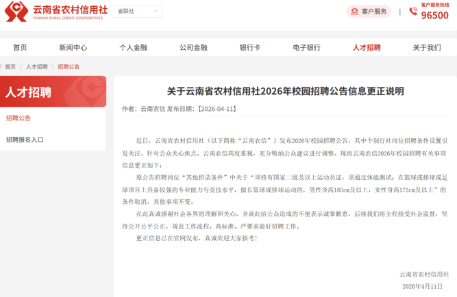 【导读】云南农信更正2026年校招信息,相关岗位取消“运动员”等招录条件