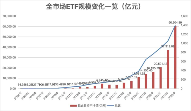 近年来,国内ETF发展突飞猛进。2020年10月,国内ETF总规模首次突破万亿元大关;2023年8月,国内ETF总规模突破2万亿元;2024年9月,国内ETF总规模突破3万亿元;2025年4月,国内ETF总规模突破4万亿元;2025年8月突破5万亿元,到了年末正式突破6万亿元大关。