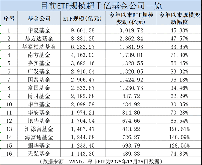 最新数据显示,ETF“千亿俱乐部”成员数量从2024年底的12家增至16家,汇添富、海富通、鹏华、天弘四家基金公司成功跻身,行业头部聚集效应进一步凸显。