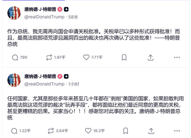 特朗普在社交媒体上发帖称:“任何想要利用荒谬的最高法院裁决来‘玩花招’的国家,特别是那些多年甚至几十年以来一直在‘敲诈’美国的国家,都将面临比他们最近同意的更高、更糟糕的关税。买家自负!!!”