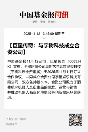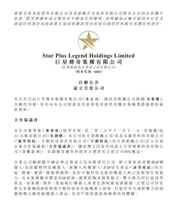 11月12日午间,巨星传奇发布公告称,公司全资子公司星创艺(昆山)文娱有限公司与宇树科技全资子公司北京灵翌科技有限公司签订合作协议书,将成立合资公司宇星娱乐科技有限公司(以下简称宇星娱乐)。