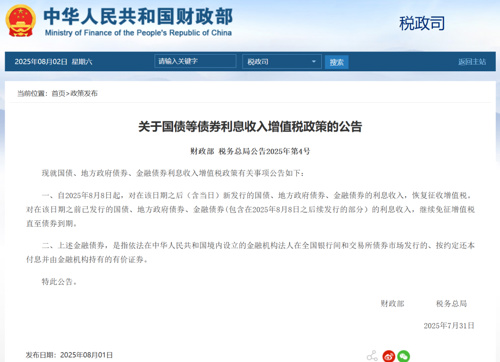 公告显示,自2025年8月8日起,对在该日期之后(含当日)新发行的国债、地方政府债券、金融债券的利息收入,恢复征收增值税。此次政策调整采用“新老划断”原则,对8月8日前已发行的相关债券利息收入,继续免征增值税直至债券到期。