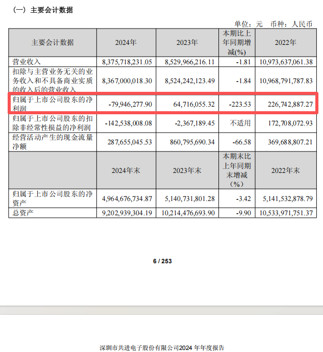 2022年至2024年,共进股份的营业收入分别为109.74亿元、85.30亿元、83.76亿元,归母净利润分别为2.27亿元、6471.61万元、-7994.63万元。
