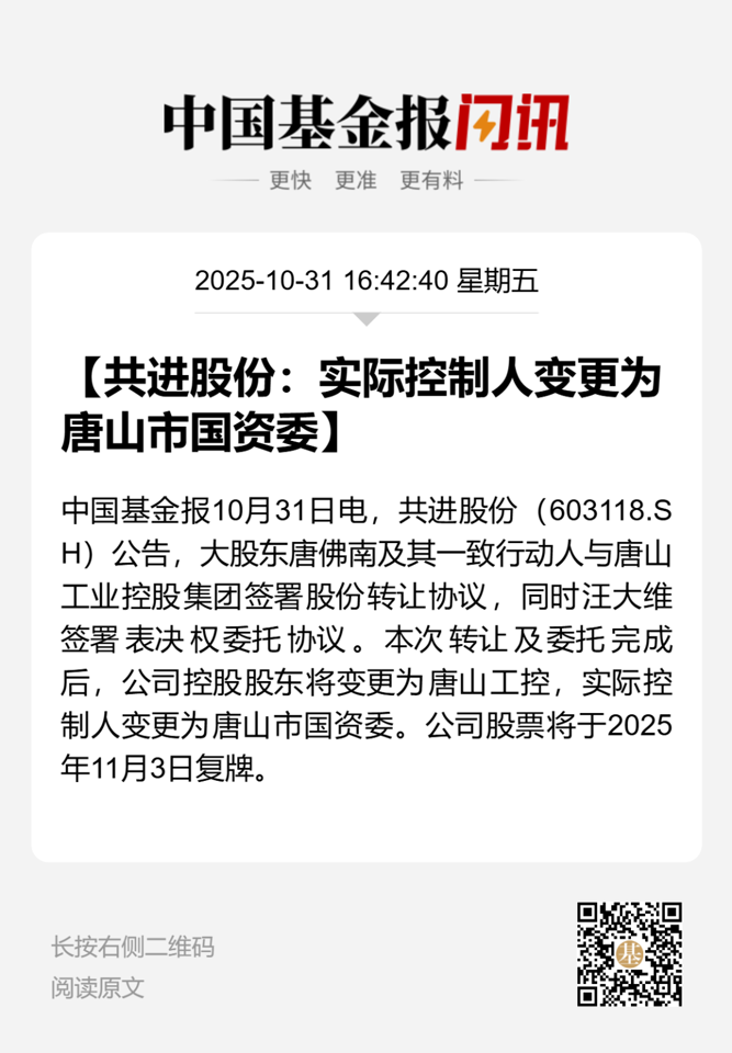 【导读】共进股份将易主唐山市国资委,计划自11月3日开市起复牌