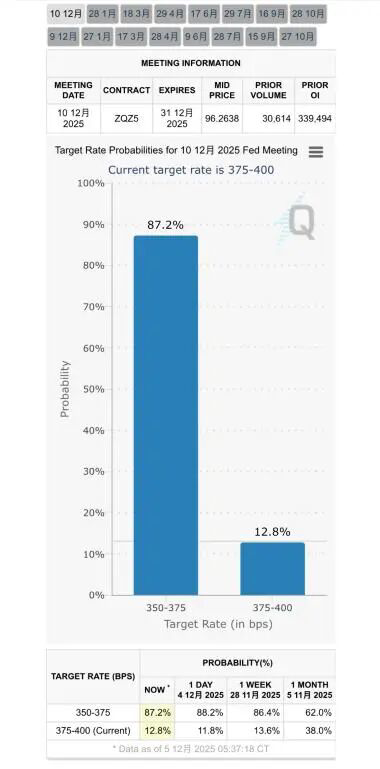 CME“美联储观察”最新数据显示,美联储12月降息25个基点的概率已升至87.2%,维持利率不变的概率仅为12.8%;到明年1月累计降息25个基点的概率为65.8%,累计降息50个基点的概率达25.1%。