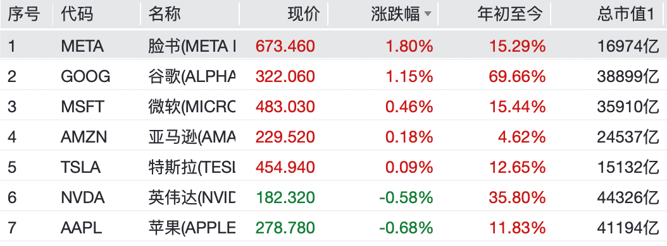 个股方面,脸书涨近2%,谷歌涨超1%,微软涨0.46%,亚马逊涨0.18%,特斯拉涨近0.1%,苹果跌0.68%,英伟达跌0.58%。