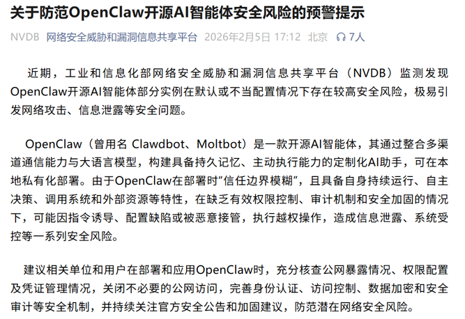 不过,“养龙虾”也需要关注风险。今年2月,工业和信息化部网络安全威胁和漏洞信息共享平台(NVDB)已发布安全预警,指出OpenClaw部分实例在默认或不当配置下存在高危风险,易引发网络攻击、信息泄露等问题。工信部提醒,相关单位和用户部署应用时需核查公网暴露情况、完善安全机制,持续关注官方加固建议。