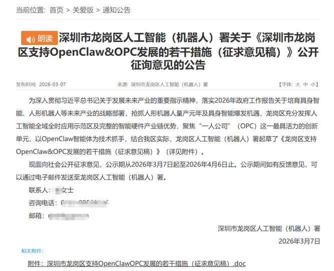 日前,深圳市龙岗区人工智能(机器人)署发布《深圳市龙岗区支持OpenClaw&OPC发展的若干措施(征求意见稿)》(以下简称《若干措施》),并面向社会公开征求意见。