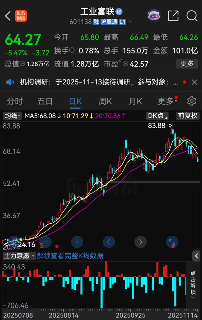 11月14日收盘,工业富联股价报64.27元/股,跌幅达5.47%,总市值为1.28万亿元。