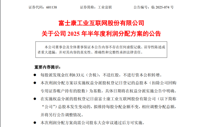 近期,工业富联发布2025年半年度利润分配方案,拟向全体股东每10股派发现金红利3.3元(含税),合计拟派发现金红利65.51亿元(含税),占公司2025年上半年归母净利润的54.08%。