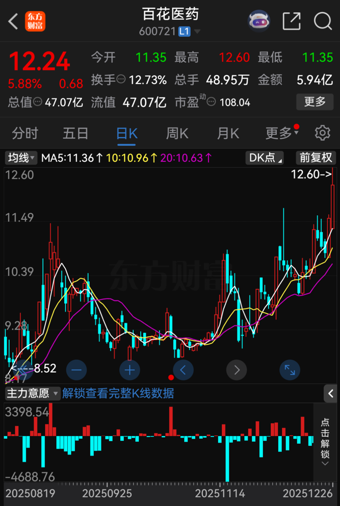 百花医药计划自12月29日开市起停牌,预计停牌时间不超过2个交易日。12月26日收盘,百花医药股价报12.24元/股,涨幅达5.88%,总市值为47.07亿元。