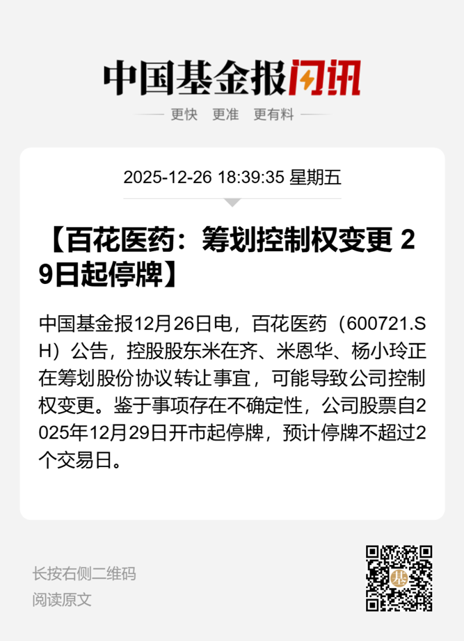 【导读】百花医药或易主,自12月29日开市起停牌