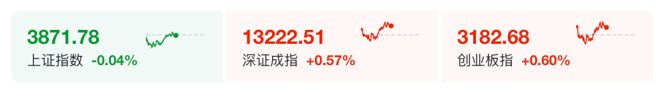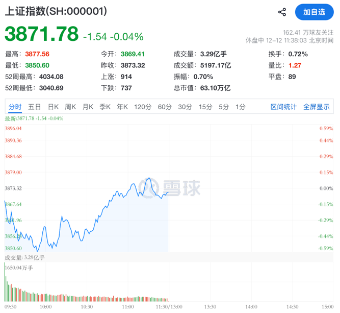 12月12日上午,A股三大股指涨跌不一。截至午间收盘,沪指报3871.78点,跌0.04%,深证成指涨0.57%,创业板指涨0.6%。