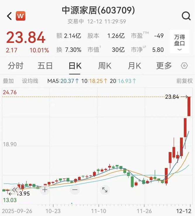 上午,中源家居再度涨停,走出7日5板。截至午盘,中源家居报23.84元/股,最新市值为30亿元。
