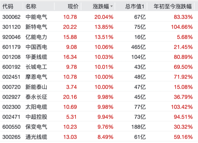个股掀“涨停潮”,中能电气录得20cm涨停,中国西电、华菱线缆、摩恩电气、长城电工、新能泰山、泰永长征、太阳电缆等多股涨停。