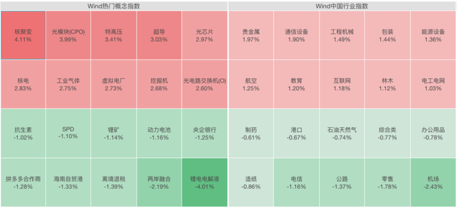 从板块看,电网设备板块领涨市场,可控核聚变、贵金属、商业航天概念股活跃;商业百货、能源金属等板块跌幅居前。