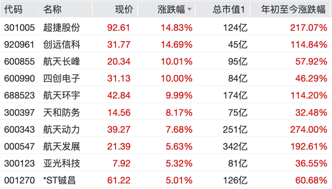 商业航天概念板块再度上涨