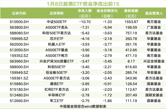 1月8日,宽基ETF资金净流出居前,达39.51亿元。其中,中证A500指数产品单日净流出居前,达13.67亿元。
