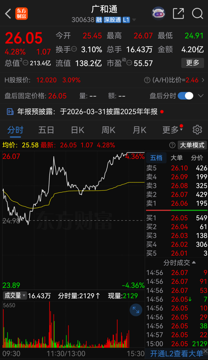 根据相关规定,广和通筹划此次交易不停牌。3月24日收盘,广和通A股股价报26.05元/股,涨幅达4.28%,总市值为213.40亿元。